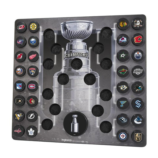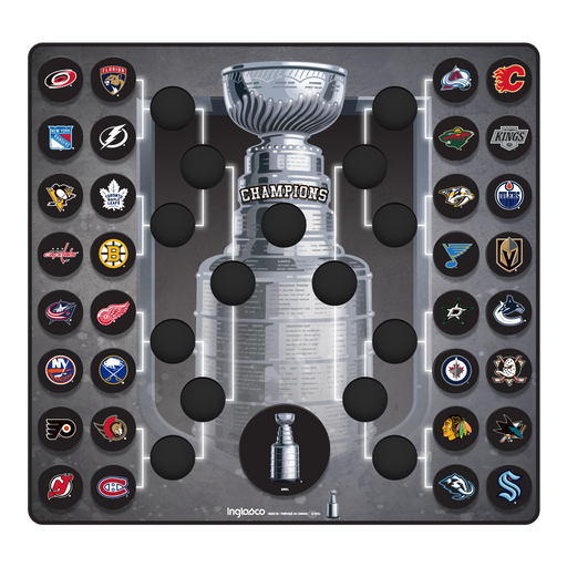 NHL Official Stanley Cup Bracket Mini Puck Wall Plaque. Follow your favourite NHL team on theirroad to the Stanley Cup! All 32 NHL teams are showcased on removable plastic mini pucks. Follow theplayoffs and move the winning teams to the next round. Included with your NHL Official Stanley CupBracket Mini Puck Wall Plaque is an official NHL Stanley Cup Playoffs puck (6oz. 1x3"). Wood plaquemeasures 17"W x 16"H. Makes a great addition to any office or fan room!