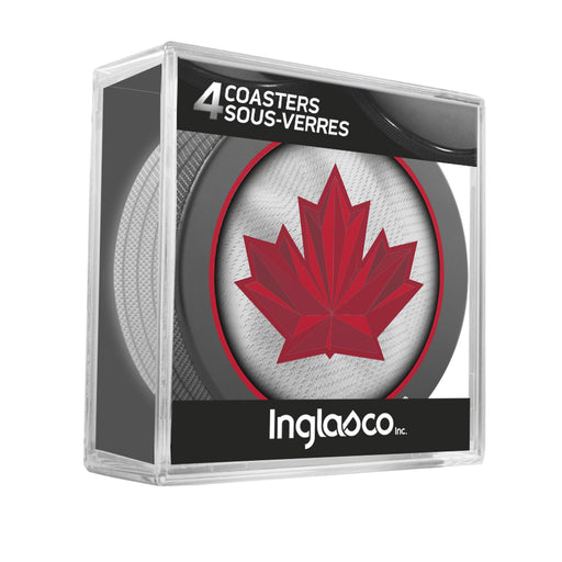 Hockey Canada Hockey Puck Drink Coasters. 4-pack in acrylic cube. Show your team colours at your next get together!