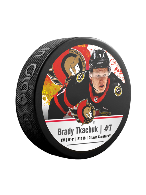 NHLPA Brady Tkachuk #7 Ottawa Senators Souvenir Hockey Puck. In clear acrylic presentation-worthy cube. (official 6oz. 1x3" puck)