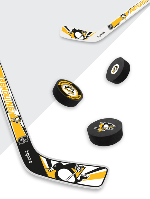 NHL Pittsburgh Penguins Breakaway Set. Includes one (1) plastic player 18" mini stick one (1) plastic goalie 20" mini stick and one (1) foam ball- ...